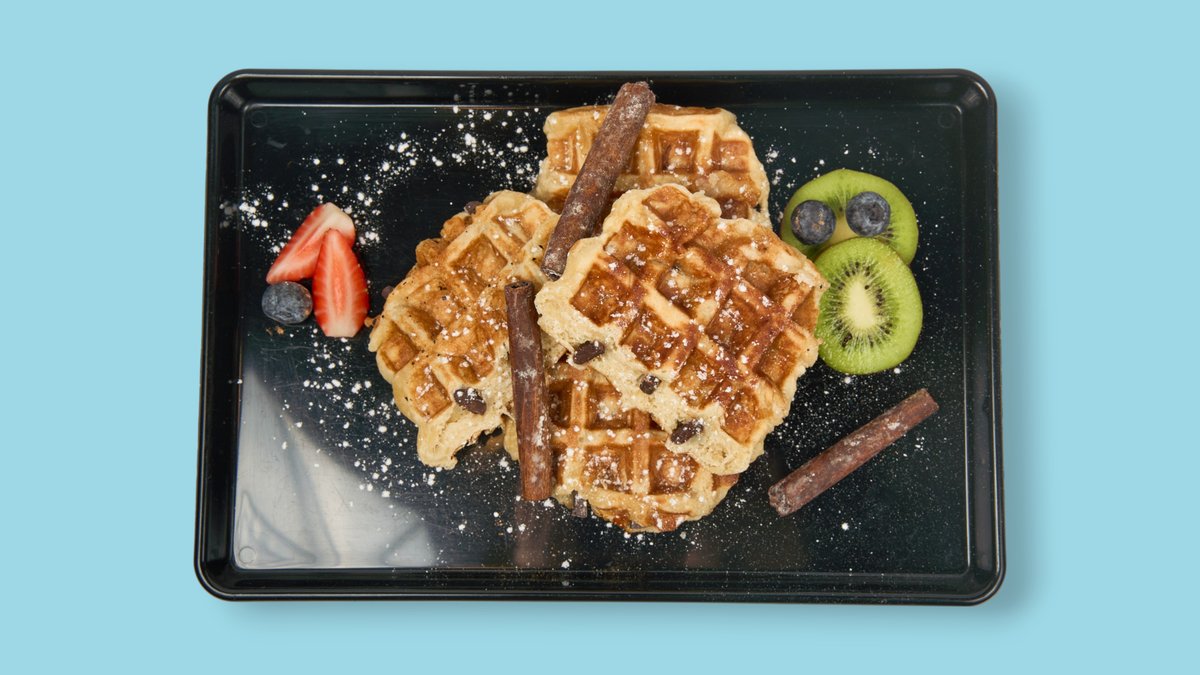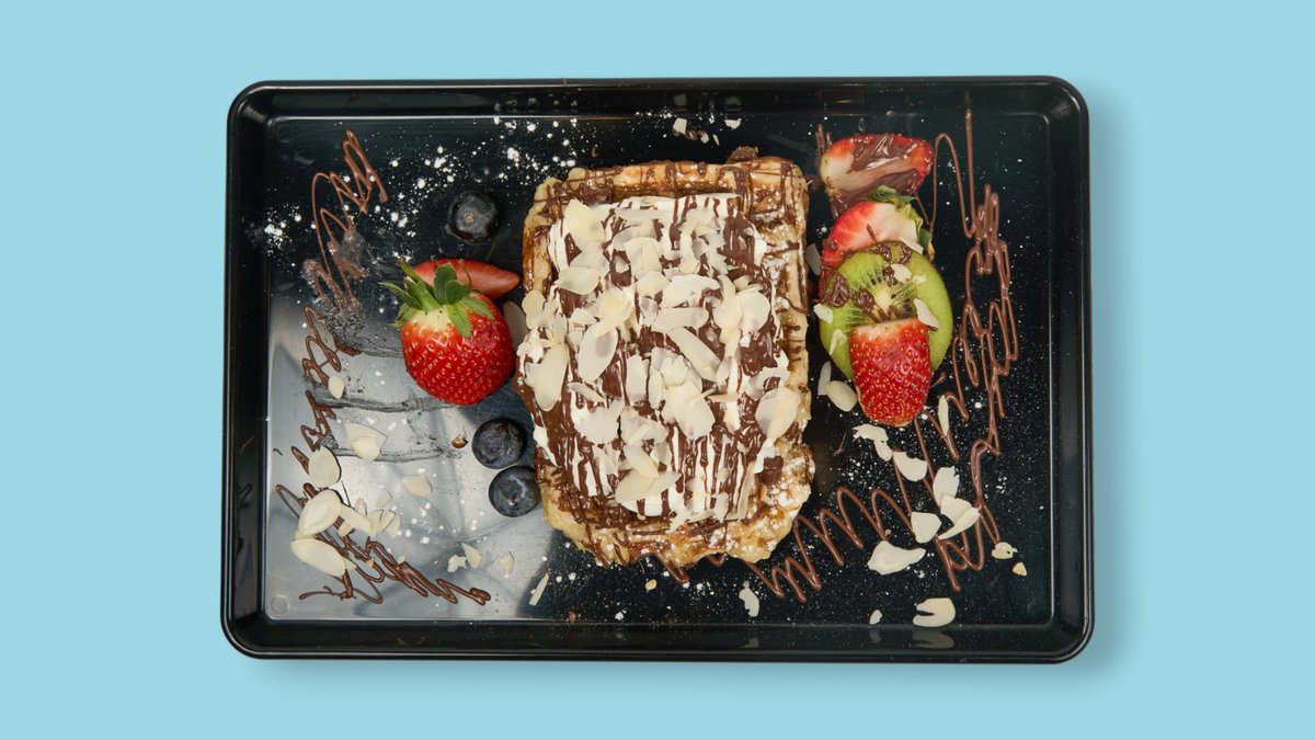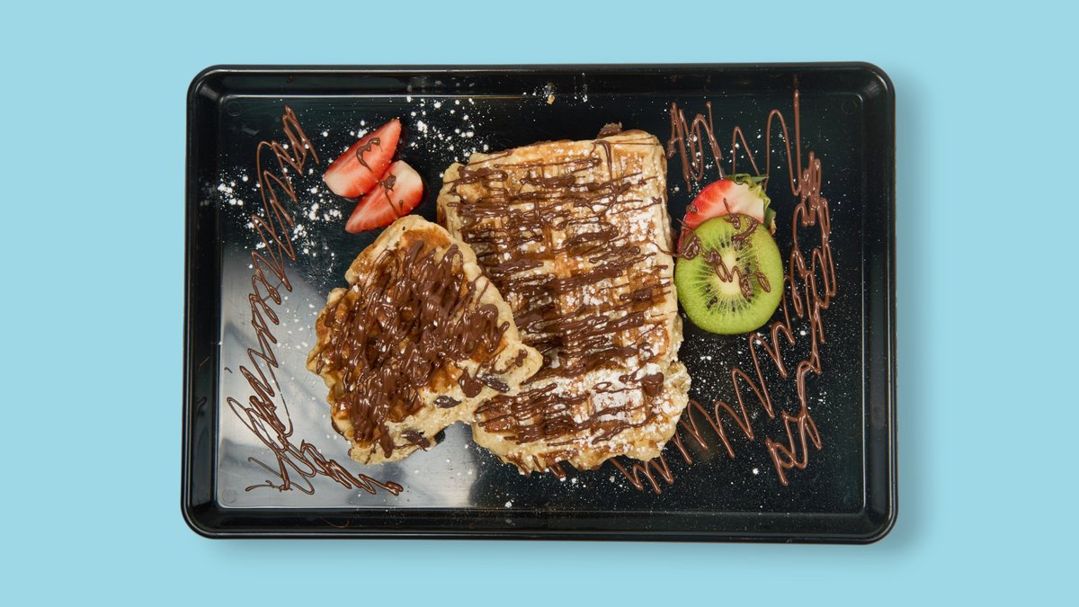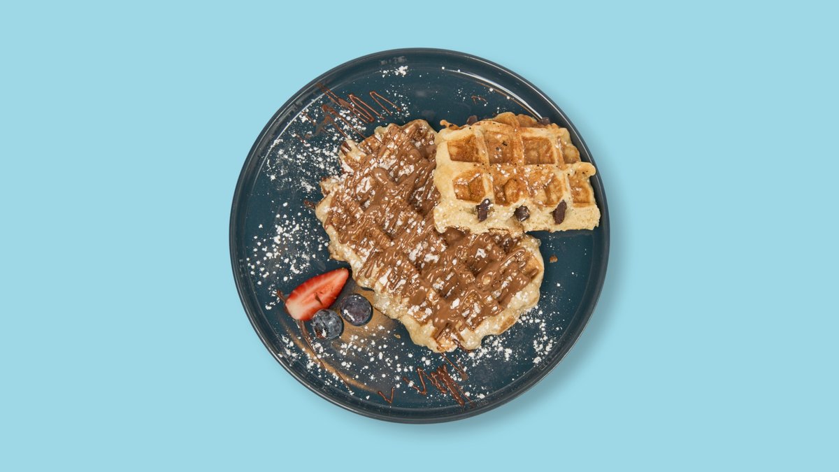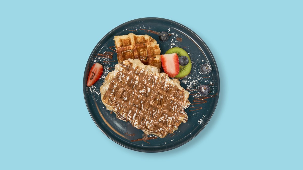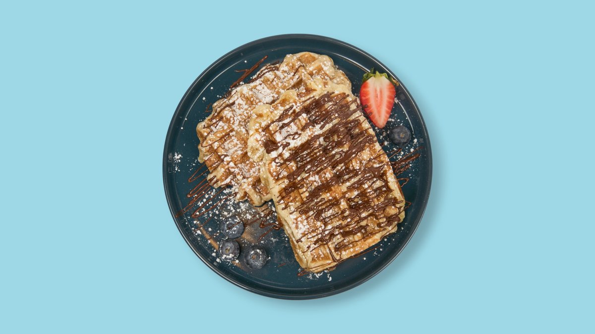 Lüticher Waffel mit belgischer Schokoladensoße Das Gericht wurde mit Schokolade zubereitet und kann Spuren von verschiedenen Nüssen enthalten.