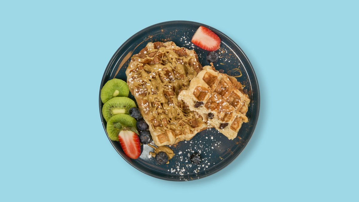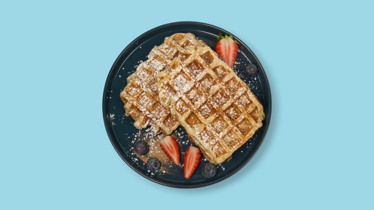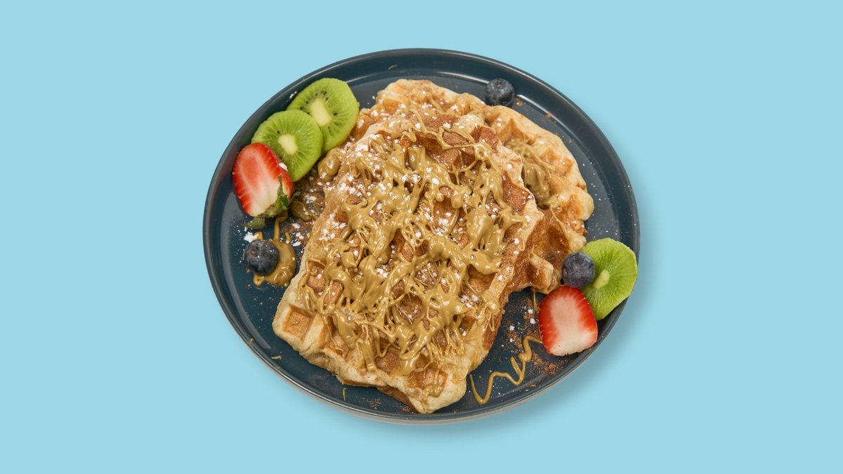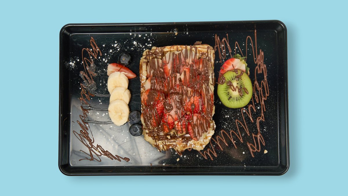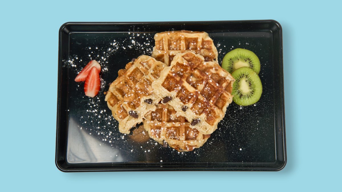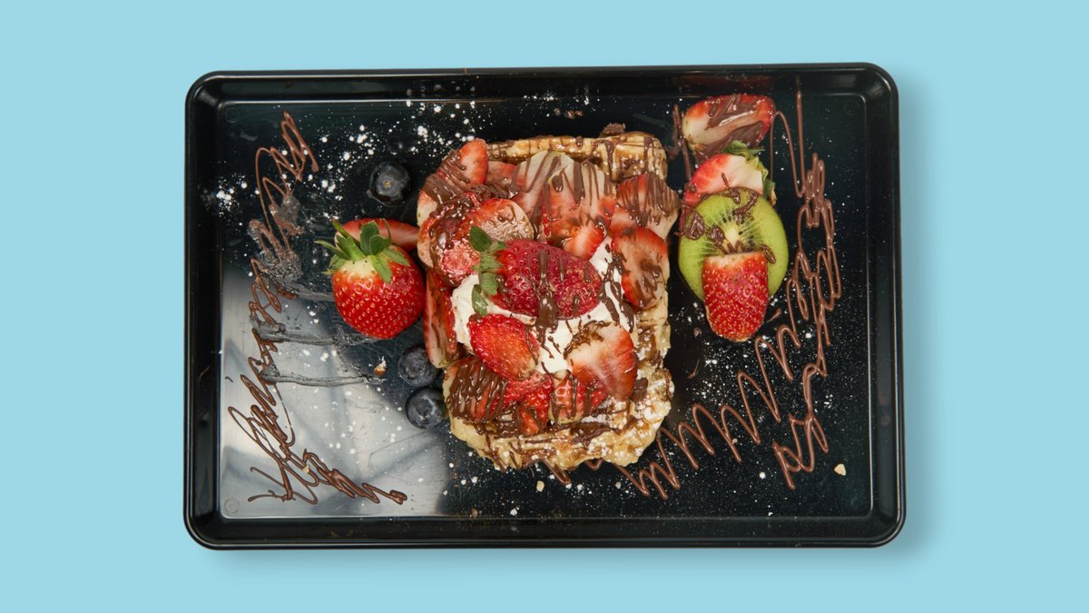 Lüticher Waffel mit belgischer Schokoladensoße Das Gericht wurde mit Schokolade zubereitet und kann Spuren von verschiedenen Nüssen enthalten.