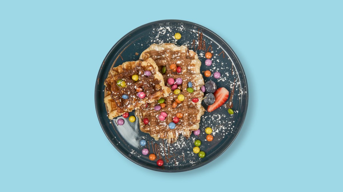 Lütticher Waffel mit Smarties und Schokoladensoße Das Gericht wurde mit Schokolade zubereitet und kann Spuren von verschiedenen Nüssen und Schalenfrüchte enthalten.