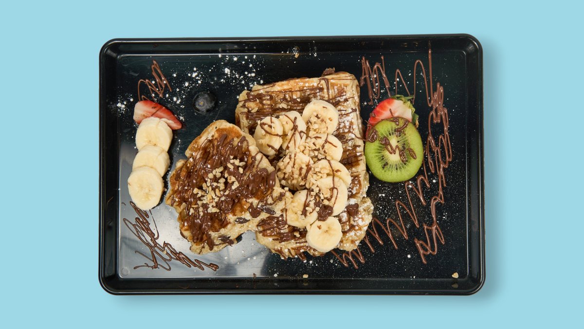 Lütticher Waffel mit Bananen, Schokoladensoße und gehackten Haselnüssen Das Gericht wurde mit Schokolade zubereitet und kann Spuren von verschiedenen Nüssen enthalten.