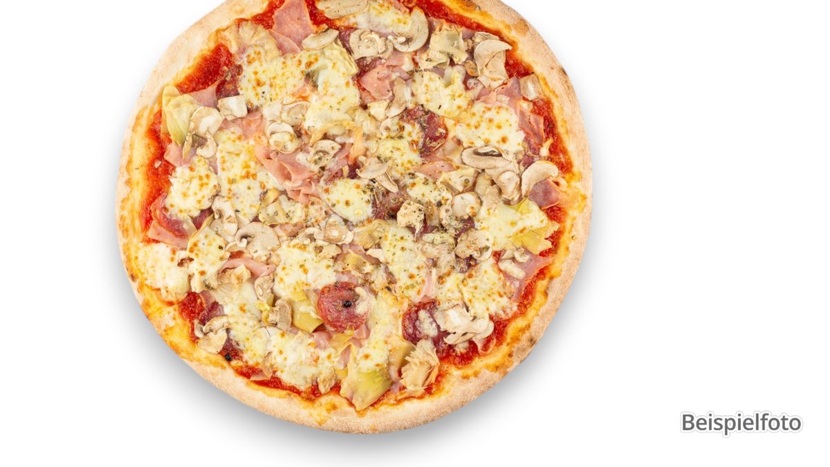 mit Tomatensoße, Käse, frischen Champignons, Mais, Zwiebeln und Salami vom Geflügel