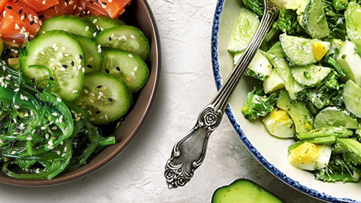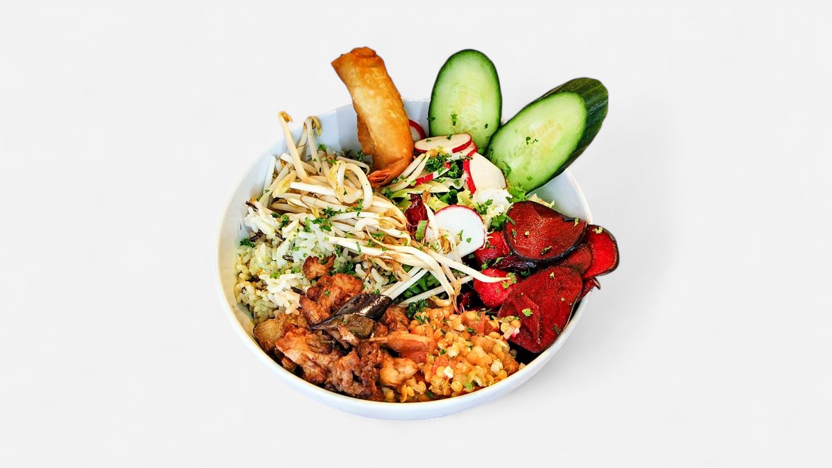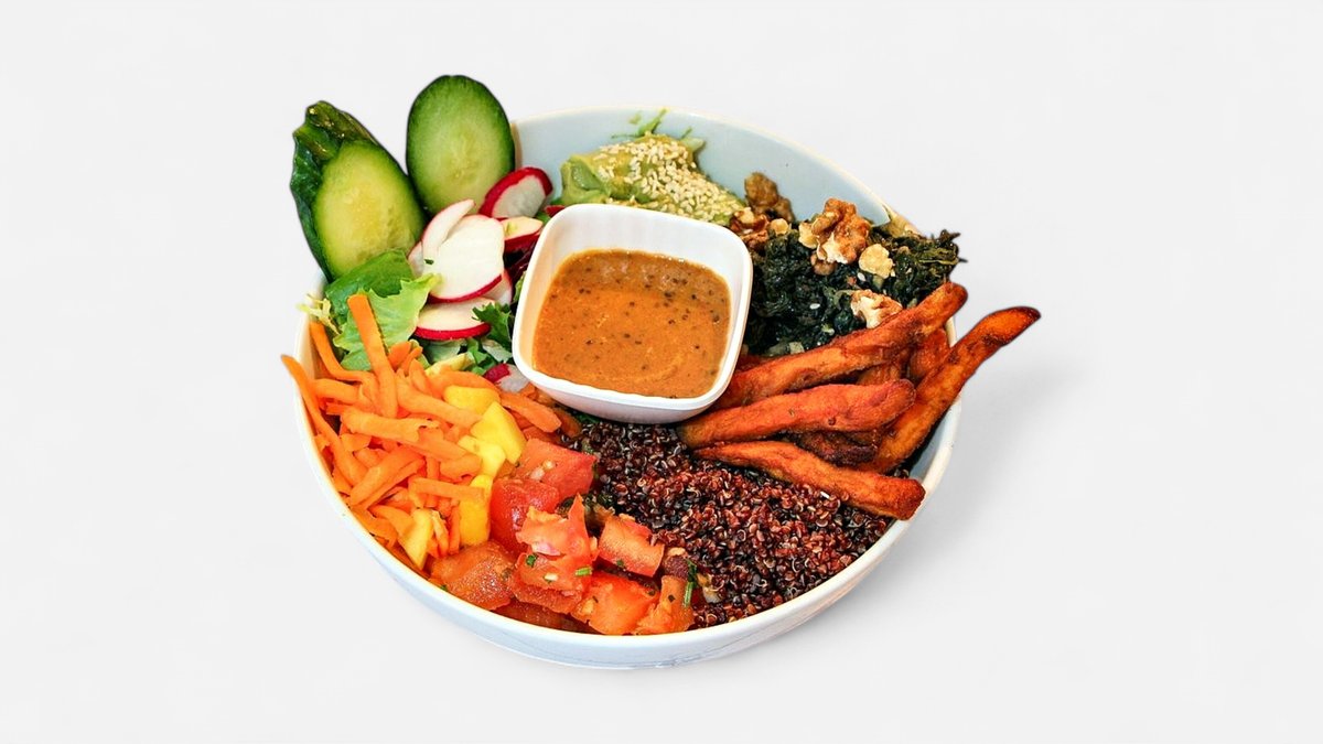 alle Bowls werden mit gemischten Greens und Superfood-Dressing zubereitet