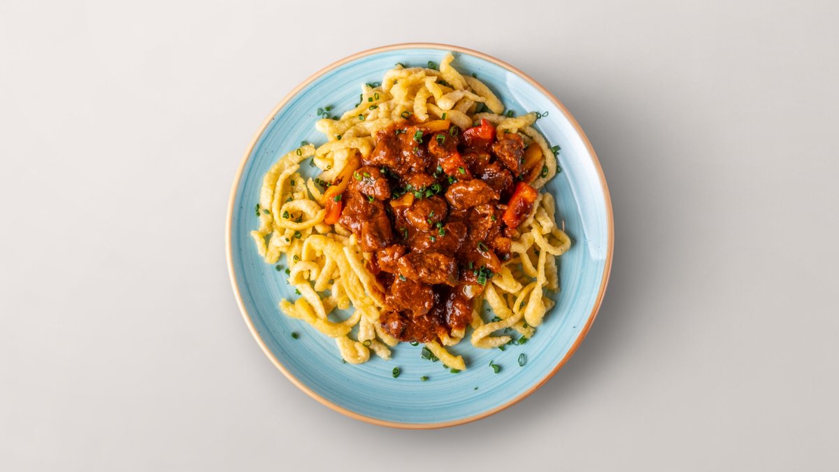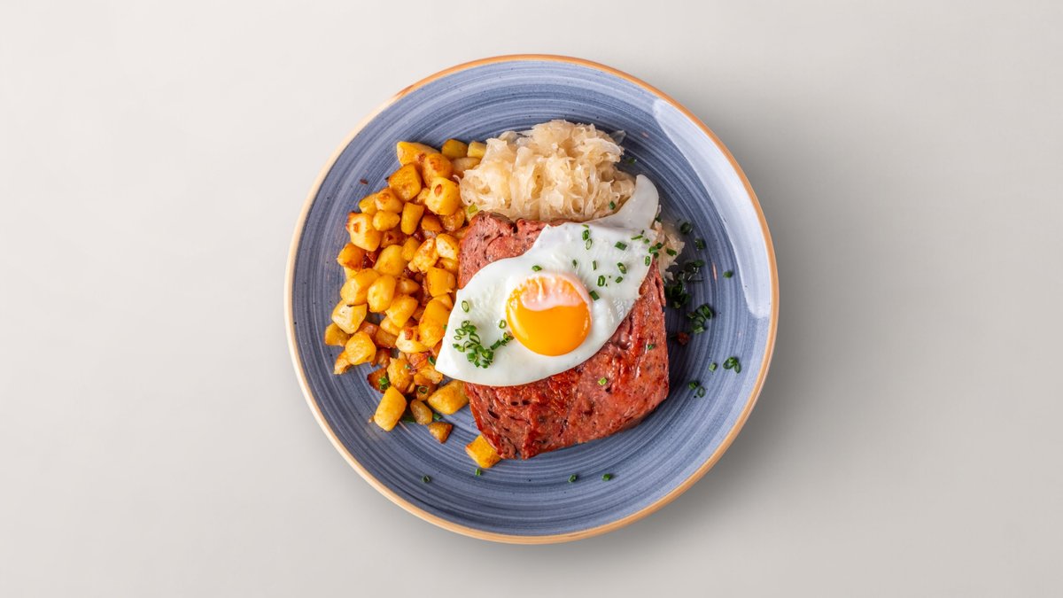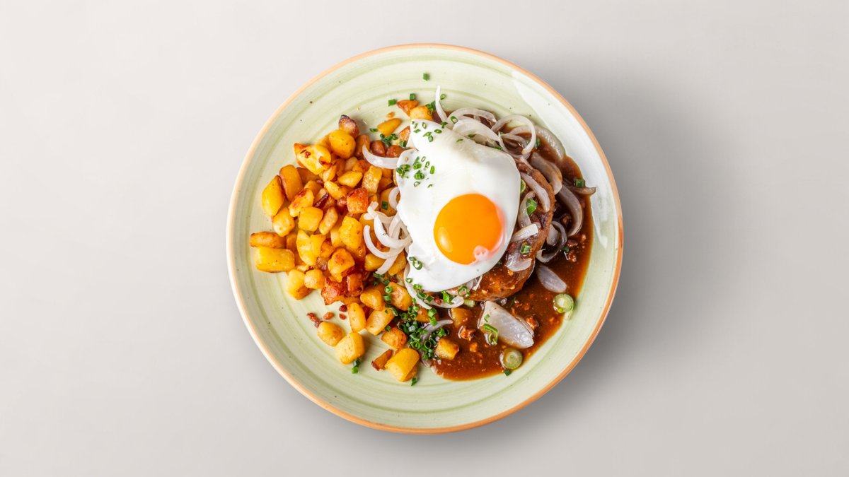 mit Hacksteak vom Rind und Schweinefleisch, Spiegelei, geschmorten Zwiebeln, Bratkartoffeln und Jus