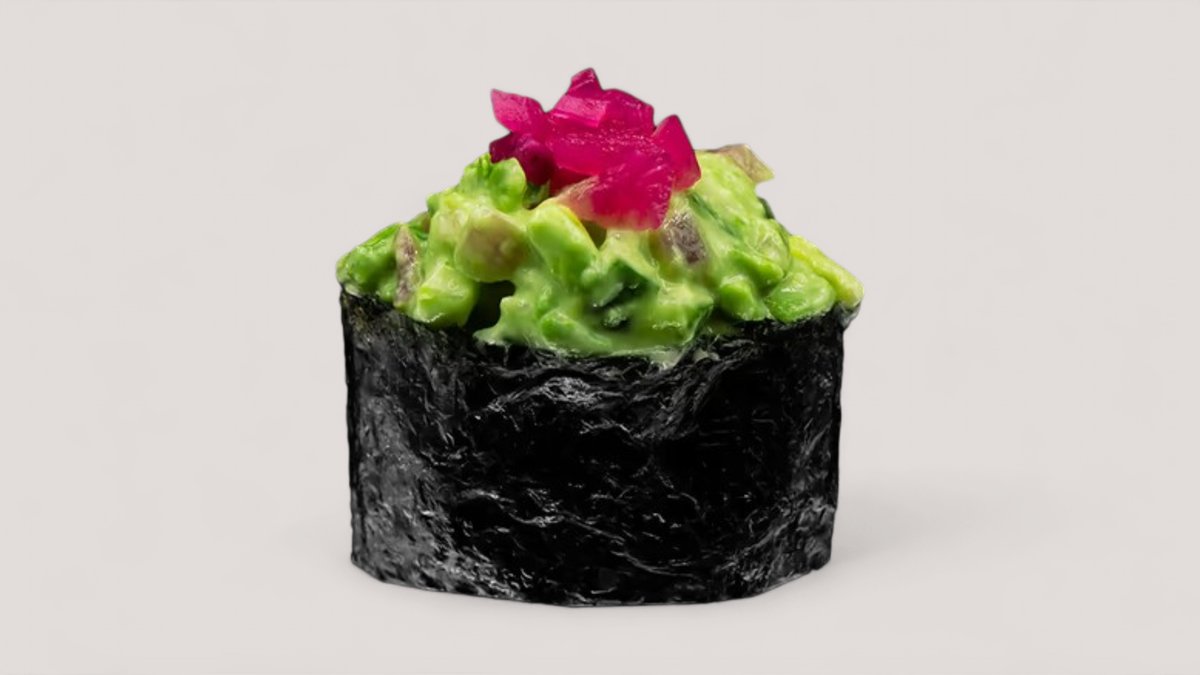 gefüllt mit Reis, Gurken, Avocado, Lauchzwiebeln, Wakame, japanischer Mayonnaise, Sesamsoße, Kimchi und Tofu, umhüllt mit Noriblatt