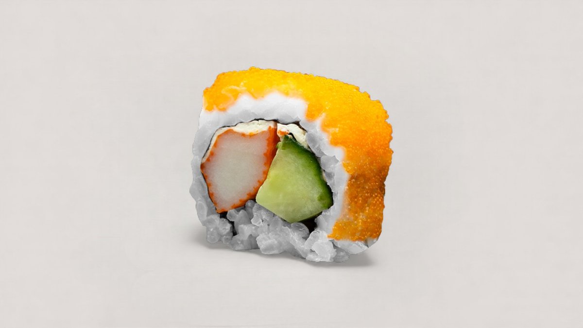 gefüllt mit Reis, Gurken, Avocado, Lauchzwiebeln, Wakame, japanischer Mayonnaise, Unagisoße, Surimicreme und Lachs, umhüllt mit Noriblatt
