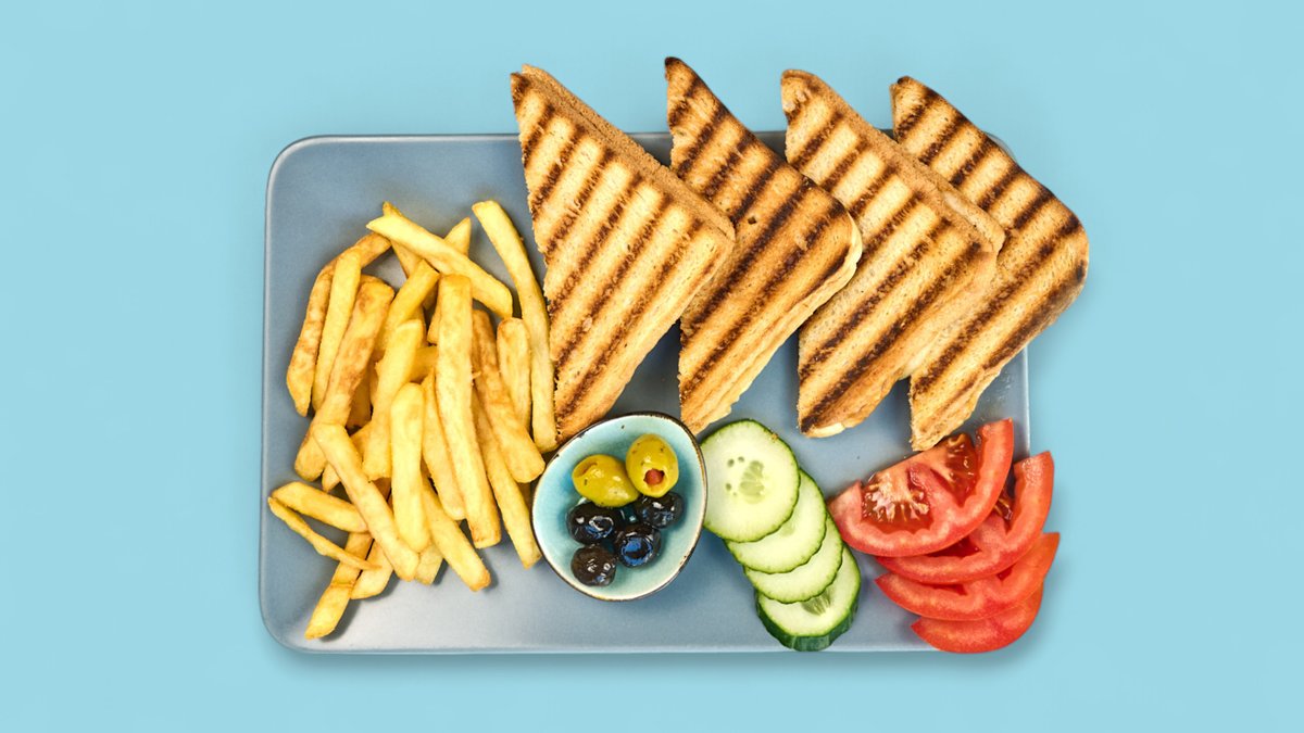 Beilagen: Tomaten, Gurken, Oliven, Käse und Butter