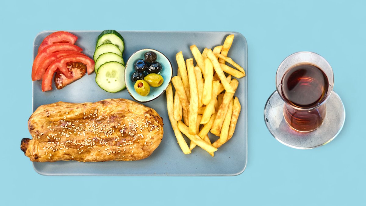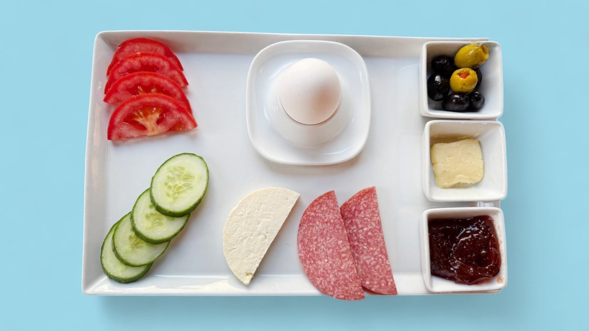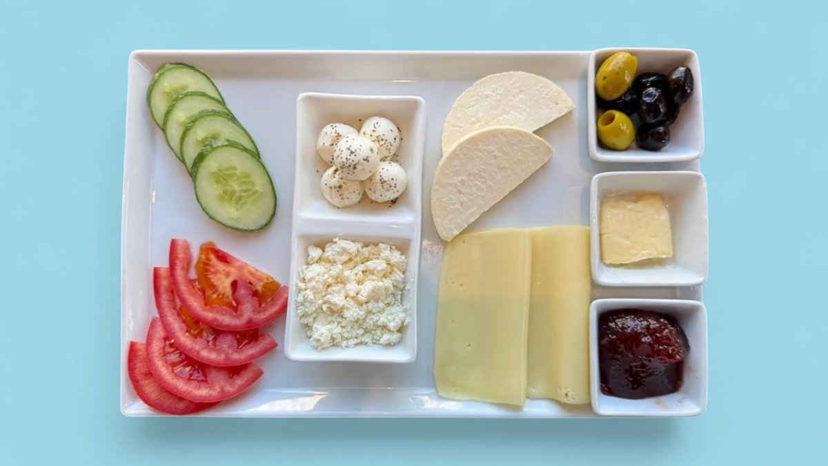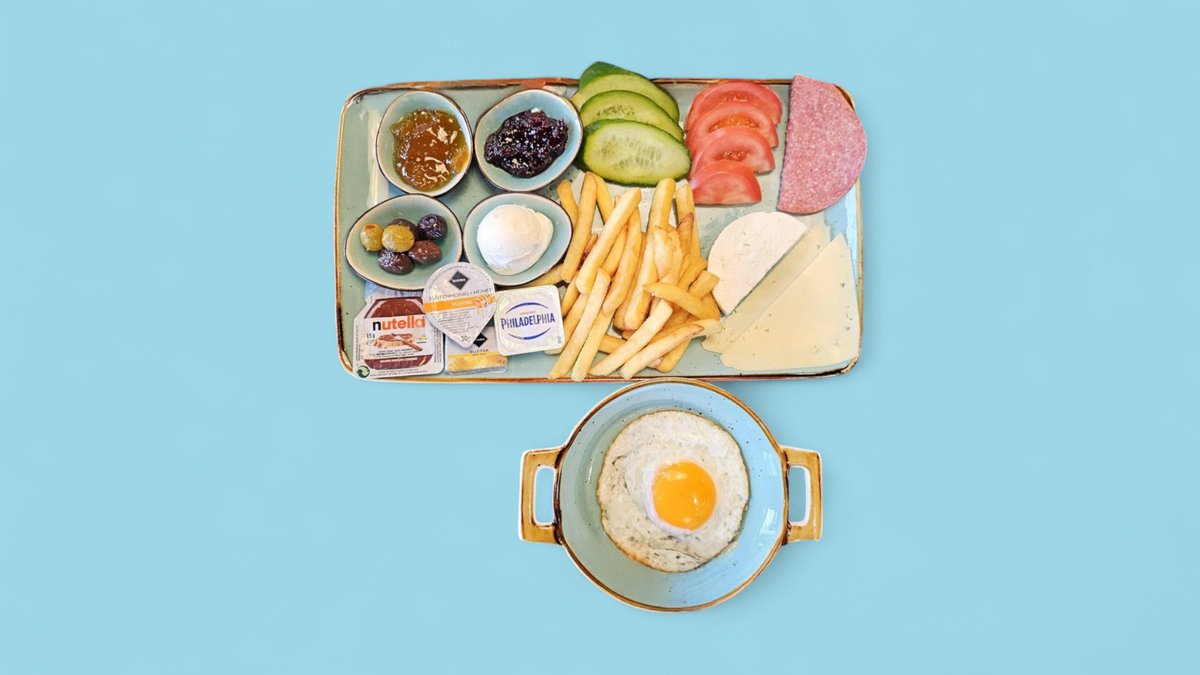 1x Simit, 1x Brötchen, Rührei, Pommes Frites, Oliven, Gurken, 2 verschiedene Käsesorten, Gemüse, Salami und 6 verschiedene Aufstriche