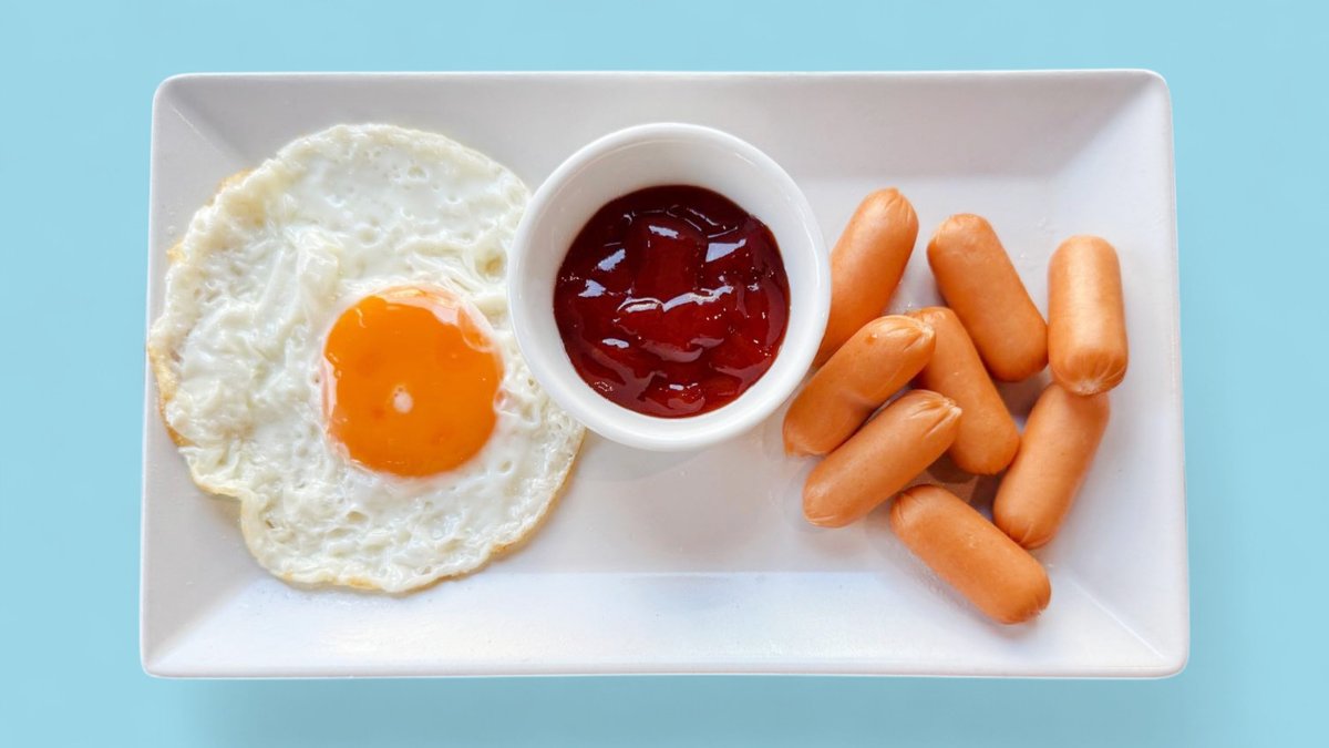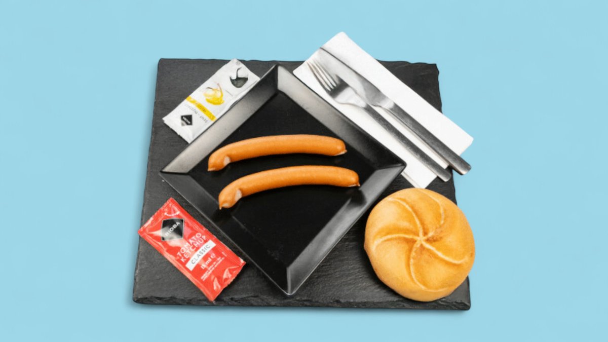 1x Brötchen, Gebratene Würstchen, Spiegel Ei, Ketchup