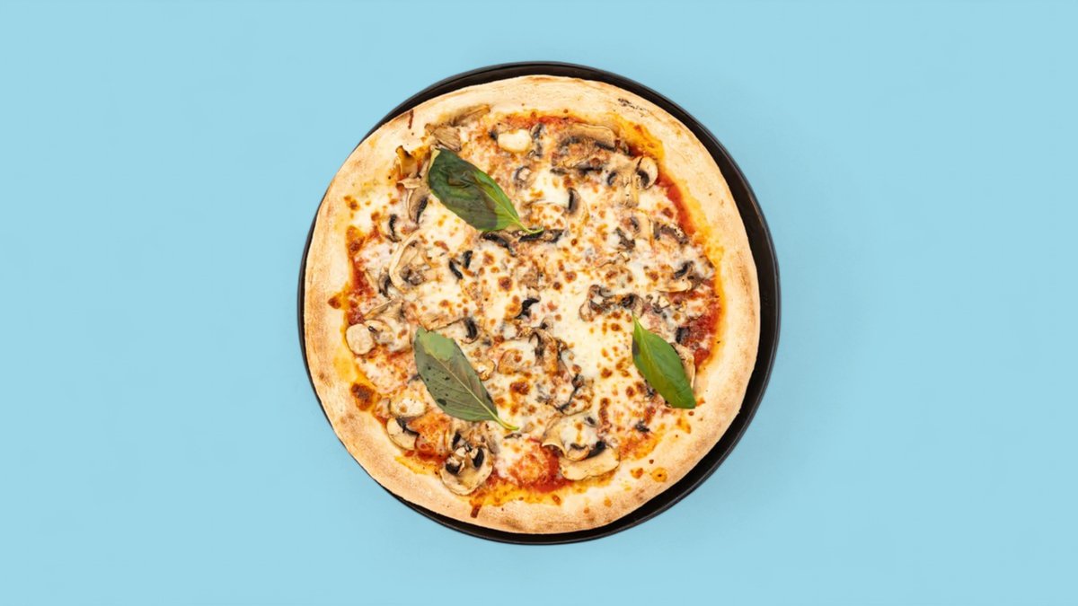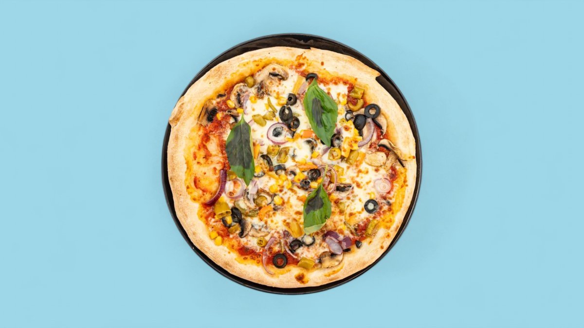 mit Champignons, Oliven, Paprika, Peperoni, Mais und roten Zwiebeln
