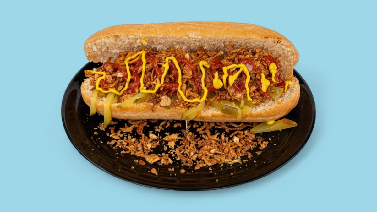 mit Geflügel, Röstzwiebeln, sauren Gurken, Ketchup und Senf