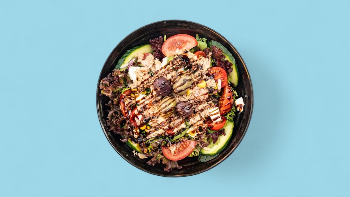 mit Thunfisch, Mais, Rucola, Kirschtomaten und Oliven mit Stein