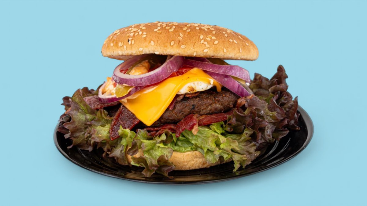 mit Spiegelei, Rinderspeck, Cheddar, Salat, sauren Gurken, roten Zwiebeln, Ketchup, Mayonnaise und Burgersoße