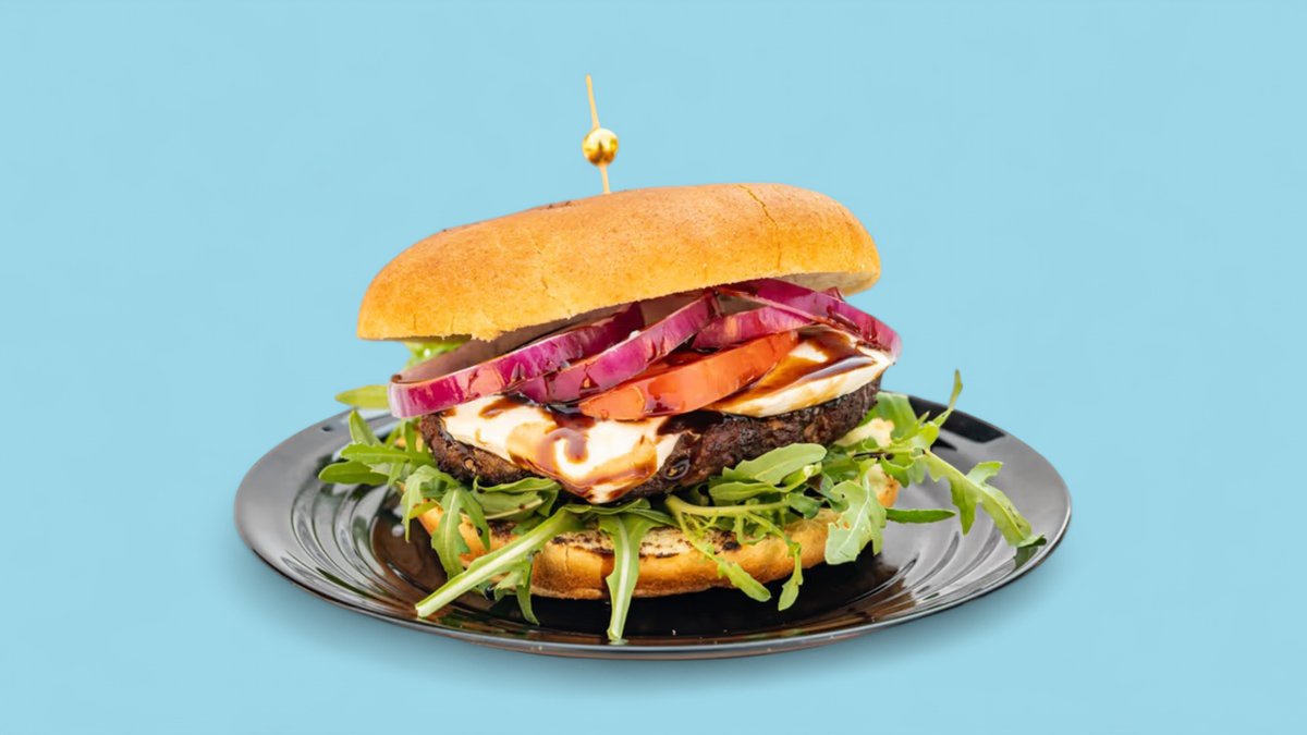 mit gegrillten Auberginen, Mozzarella, Rucola, roten Zwiebeln, Balsamicocreme und Burgersoße