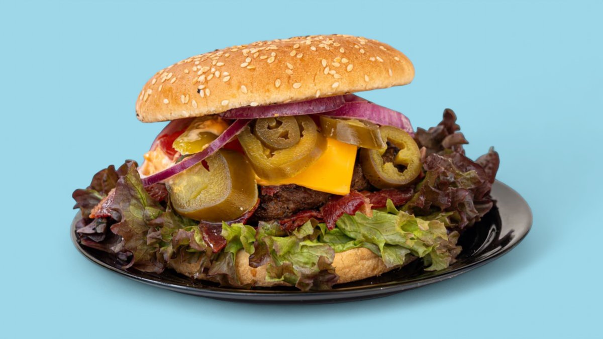 mit Cheddar, Rinderspeck, Salat, sauren Gurken, Jalapeños, scharfem Senf, scharfer Salsa und Burgersoße