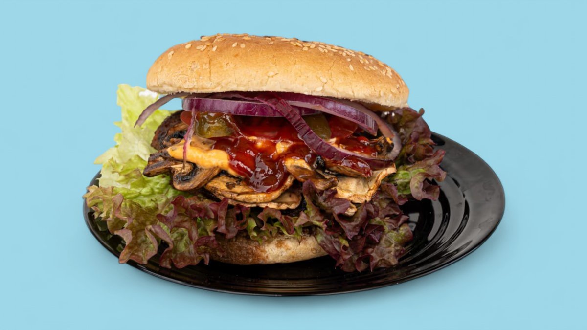 mit gegrillten Champignons in Sojasoße, Salat, sauren Gurken, roten Zwiebeln, Barbecuesoße und Burgersoße