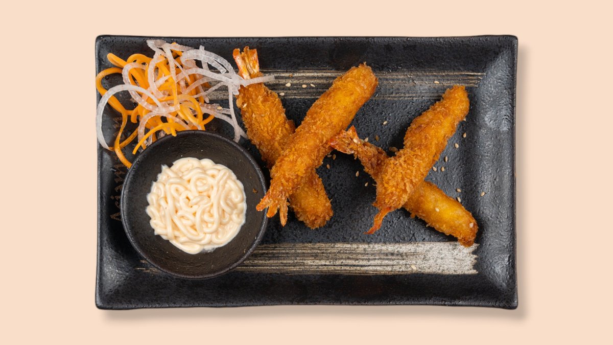 mit Riesengarnelen paniert, Salat, Avocado und Shiso