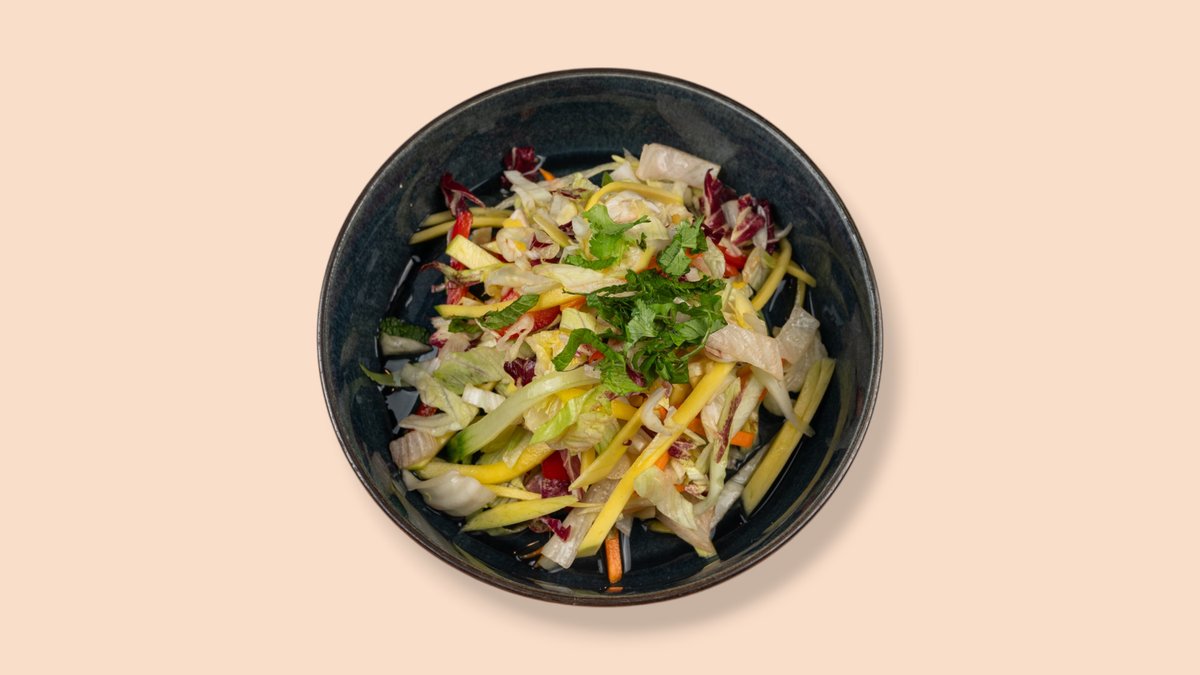 mit gebackenes Hähnchen, Mangostreifen, Gurken und Sesam