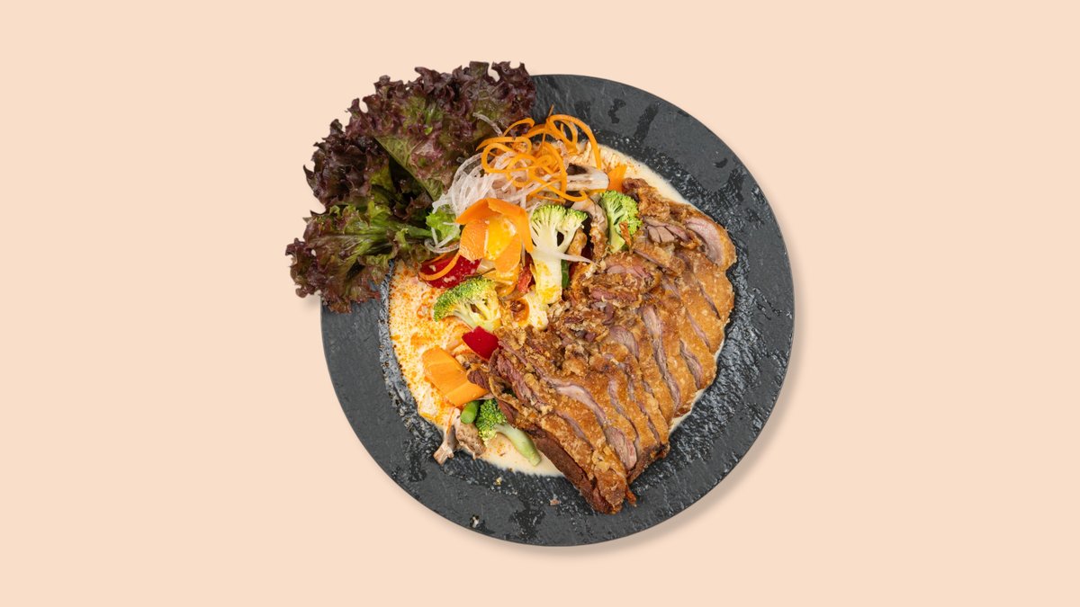 gebackener Ente mit flambiertes Thunfisch, pikant on top, Chili- und Tsukisoẞe