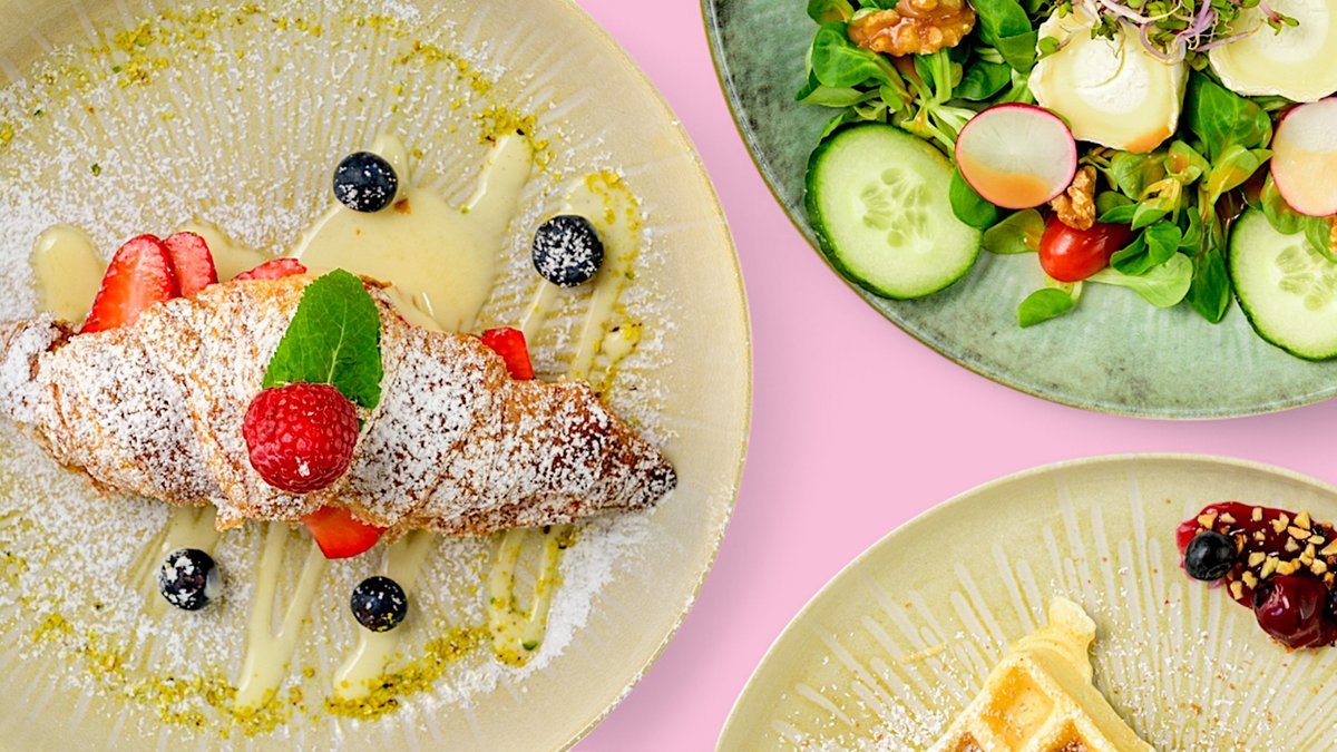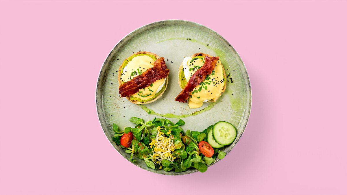 warmes Croissant, Freilandei, Käse, knuspriger Speck und Sauce hollandaise