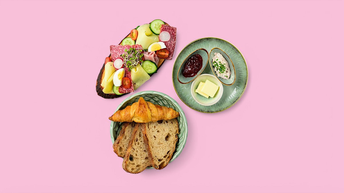 pro Person Bauernbrot, Croissants, Wurstaufschnitt (Schweinefleisch), Fleischsalat (Schweinefleisch), Käse, Kirschtomaten, Radieschen, Blattsalat, Joghurt mit frischen Früchten, hartgekochtes Ei, Marmelade und Butter