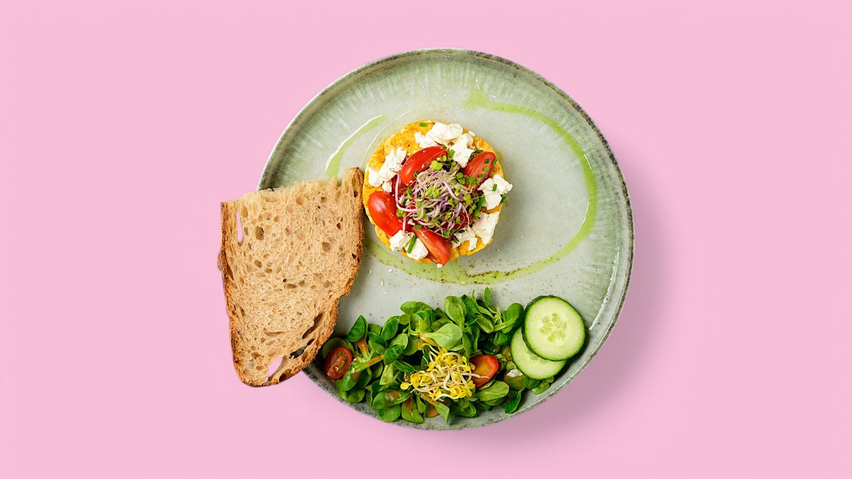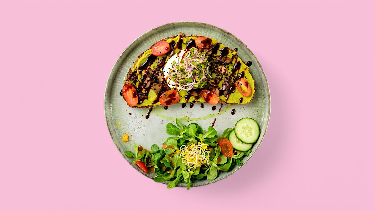Landbrot La Miche, Avocadomus, Champignons, Kirschtomaten, Himbeer-Balsamico-Dressing und mallorquinisches Olivensalz