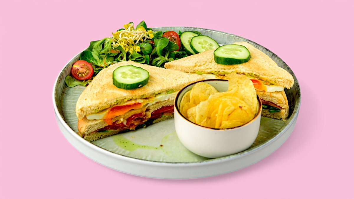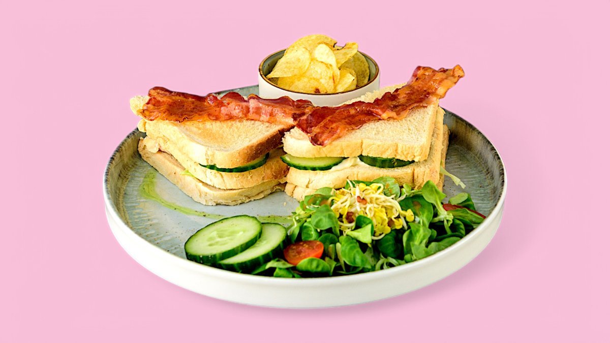 geröstetes Toastbrot, Hähnchenbrust, knuspriger Speck, Spiegelei, Eisbergsalat, Gurken und Mayonnaise, dazu Kartoffelchips