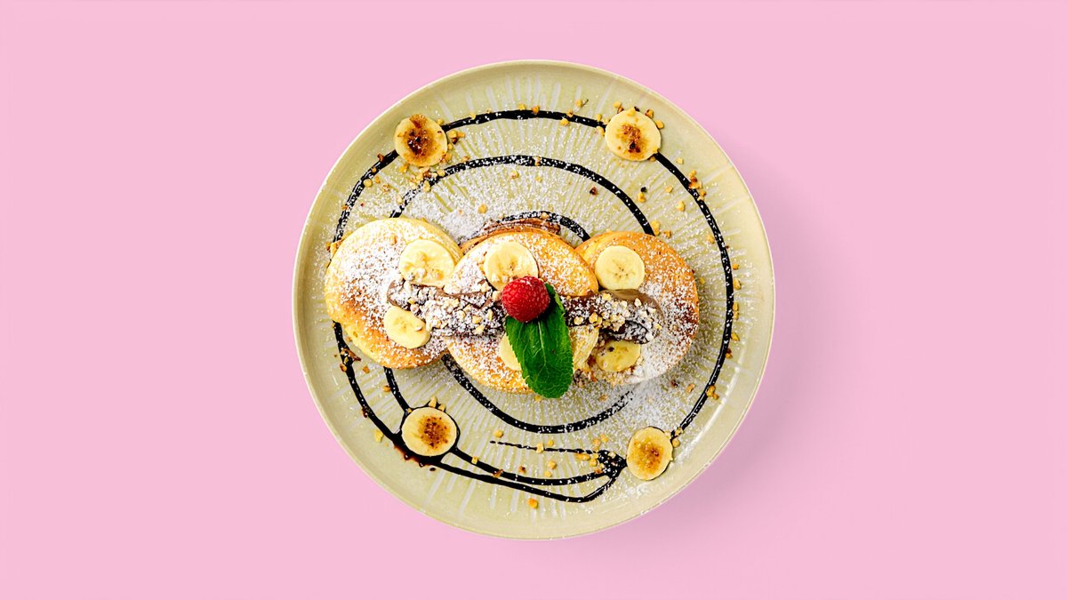Pfannkuchen, karamellisierte Bananen, gebrannte Mandelsplitter, frische Früchte und Nutellasoße