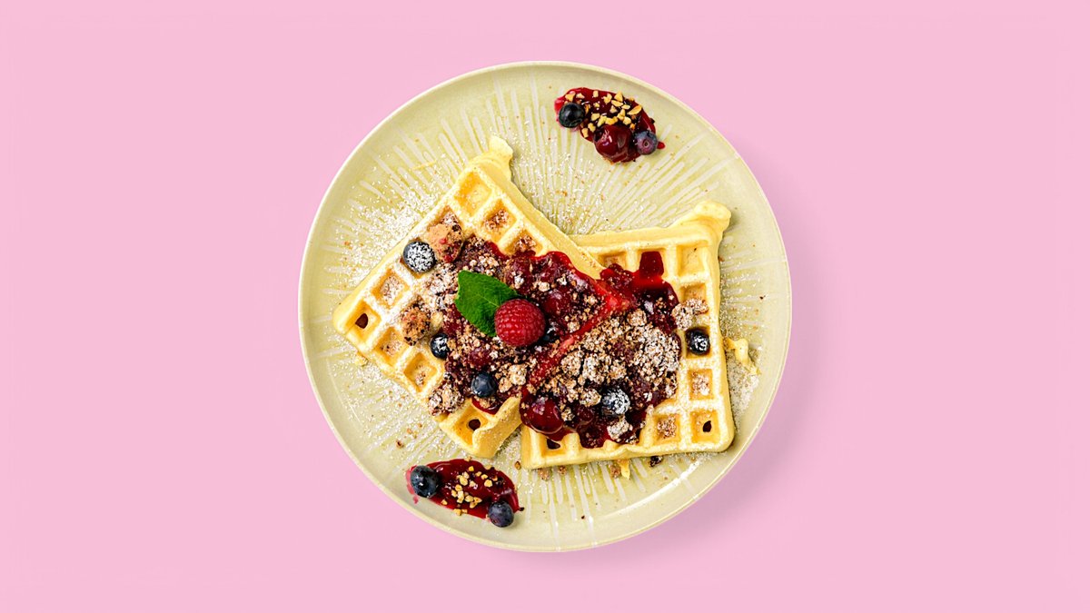 hausgemachte Waffeln, Kekseis, Schokosoße, Vanillesoße, Keksstückchen und frische Früchte Das Gericht wurde mit Schokolade zubereitet und kann Spuren von verschiedenen Nüssen enthalten