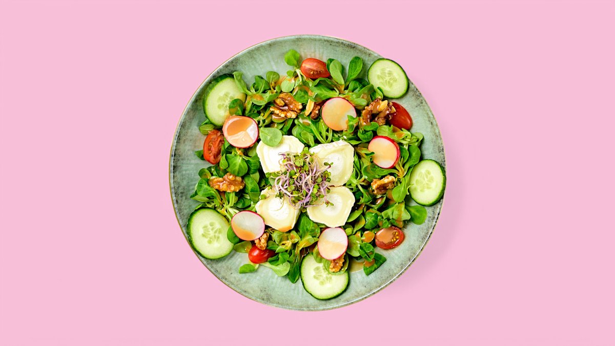 Feldsalat, karamellisierter Ziegenkäse, Rote Beete, Birne, Walnusshonig und Balsamico-Dressing, dazu Landbrot