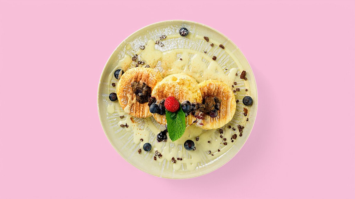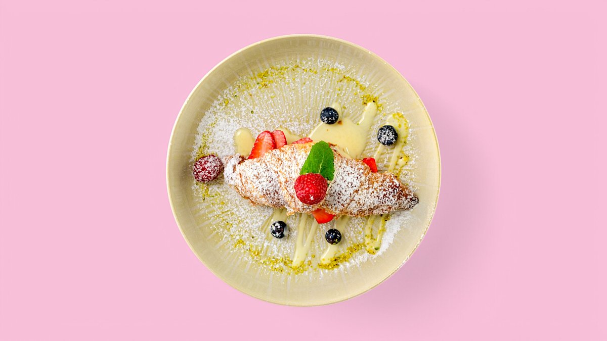 warmes Croissant, Vanillesoße, frische Erdbeeren und Blaubeeren