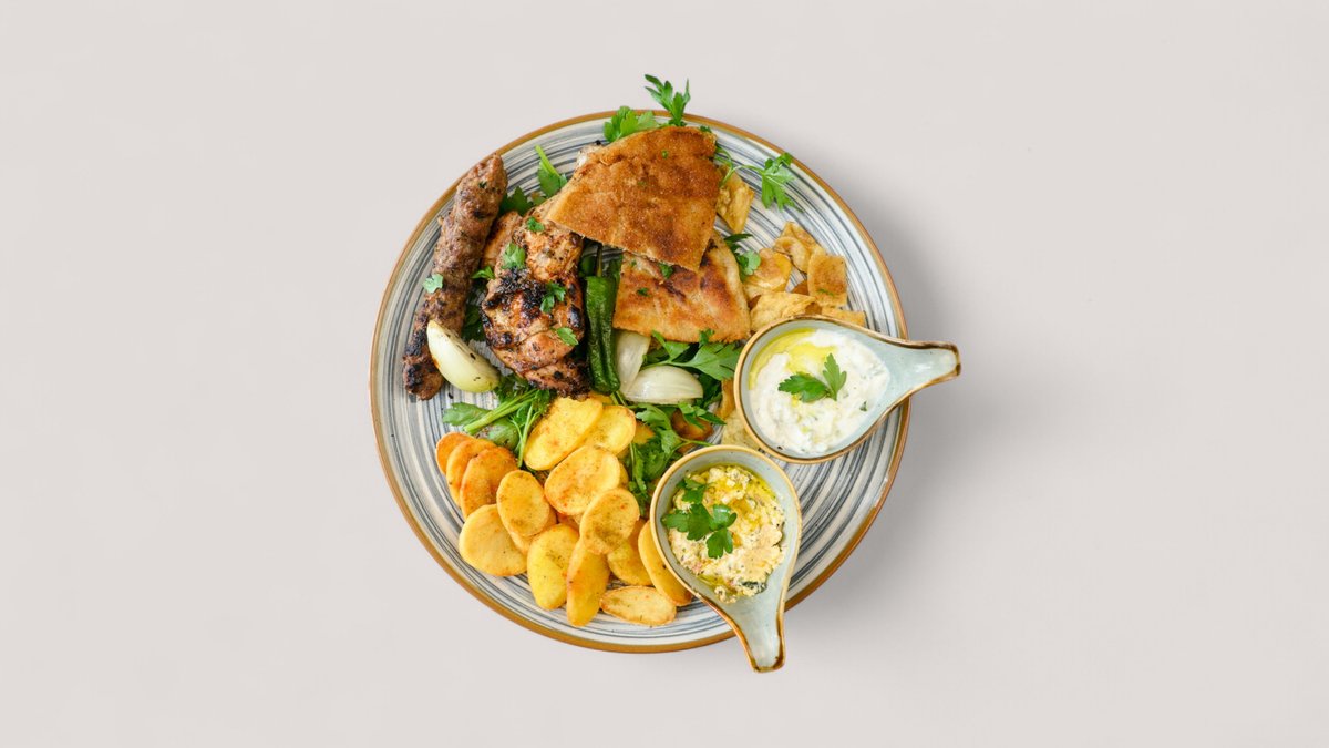 mit Köfte vom Rind, Hähnchenoberschenkel und Hawawshi mit Beilagen und 2 Vorspeisen