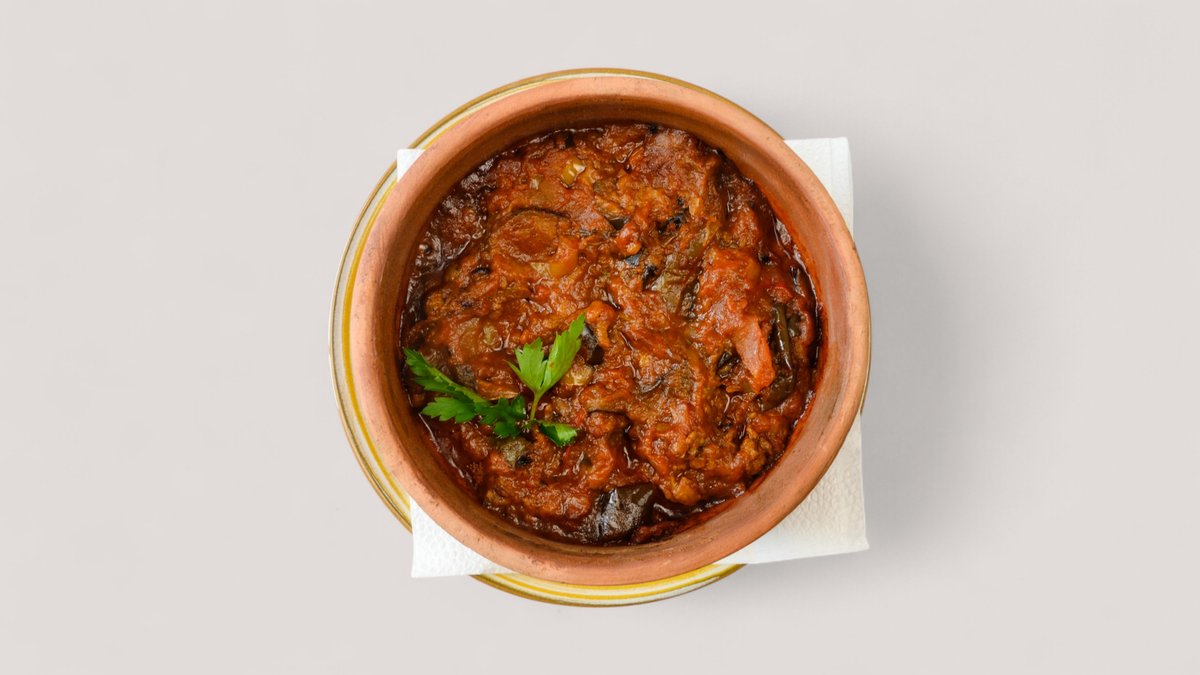 auch vegan möglich geschichtetes Gericht aus Auberginen, Paprika, Rind-Hackfleisch und Tomatensoẞe, serviert mit einer Beilage nach Wahl