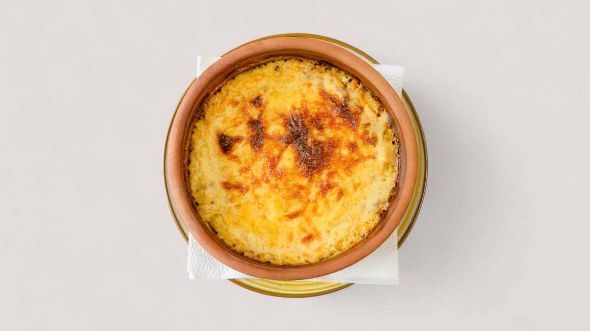 Penna-Nudeln mit Béchamelsoße und gewürztem Rind-Hackfleisch, im Tontopf gebacken