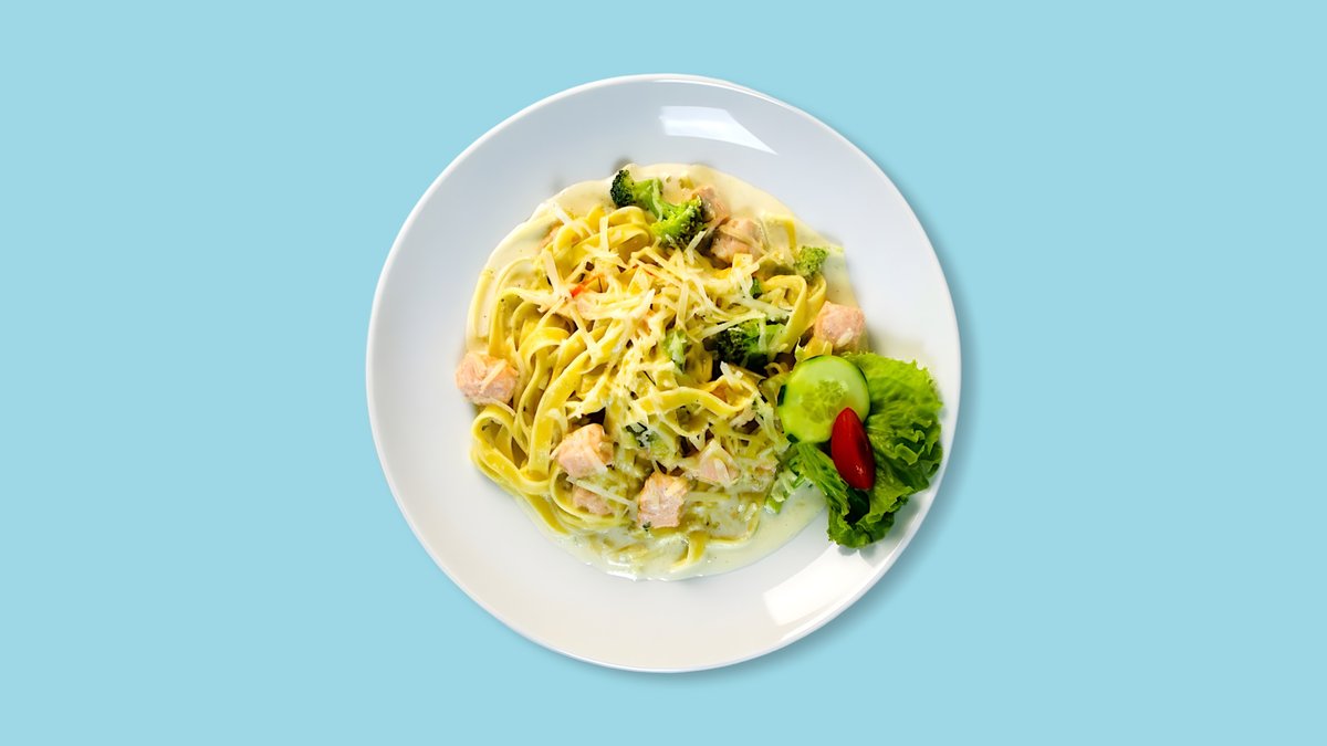 mit Lachswürfel und Brokkoli in Sahnesoße und Parmesan