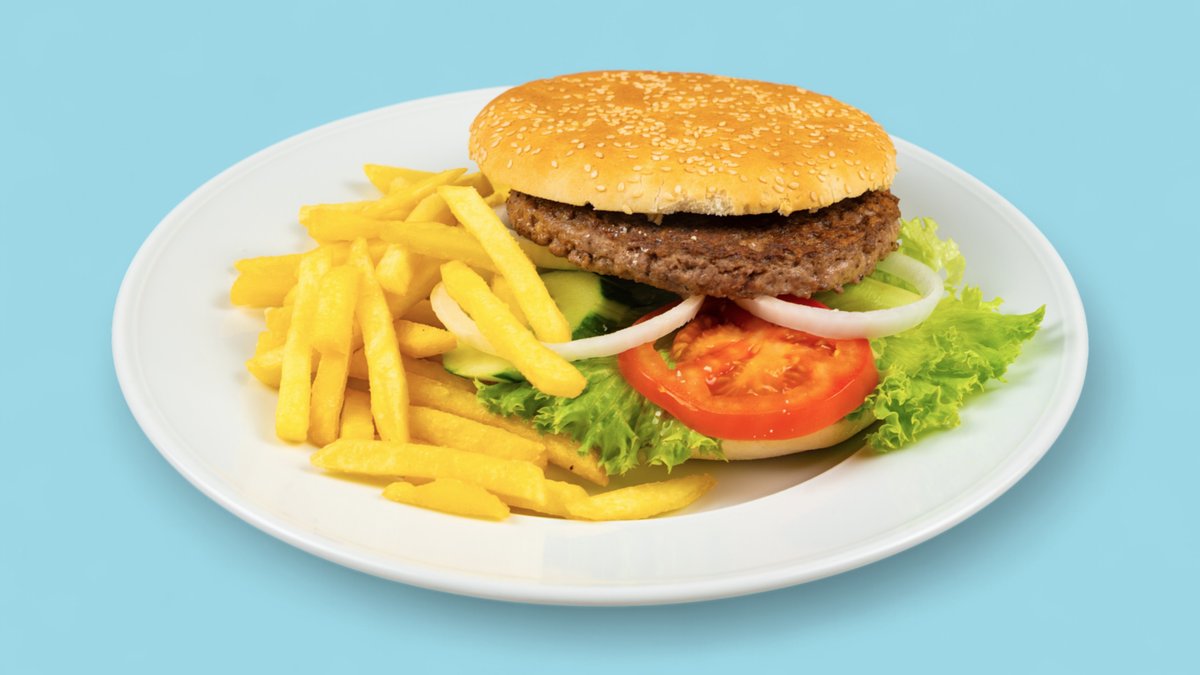 alle Burger sind groß und werden mit Rinderhack, Tomaten und Gurken zubereitet und mit Pommes frites serviert