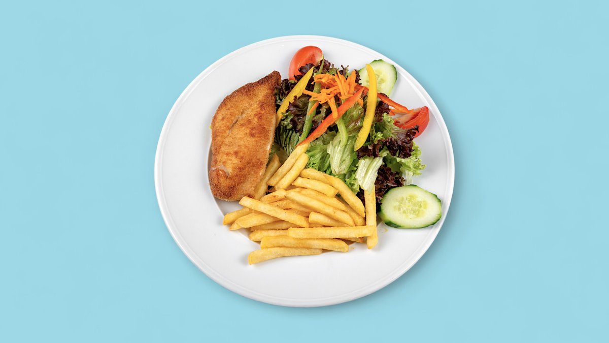 Hähnchenbrust mit Pommes und Salat