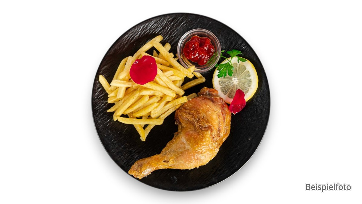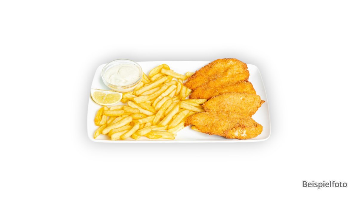 mit Fleisch vom Schwein, Pommes frites und kleiner Beilagensalat