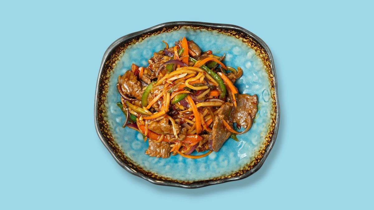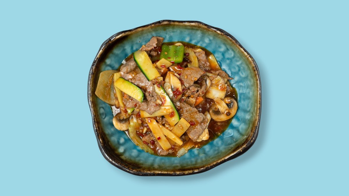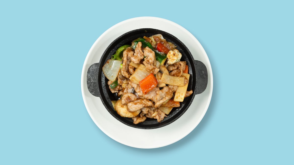 1x Rindfleisch, Schweinefleisch, Hähnchenfleisch, Garnelen, verschiedenem Gemüse und Hoisin-Soße