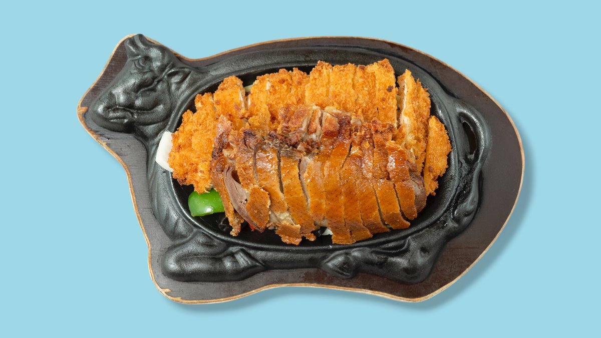 alle Gerichte werden mit knuspriger Ente, panierter Hähnchenbrust, gebratener Reis, gebackenen Bananen und einer Beilage deiner Wahl zubereitet, und für zwei Personen serviert