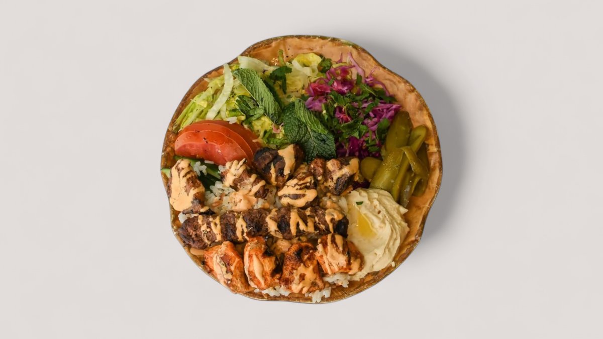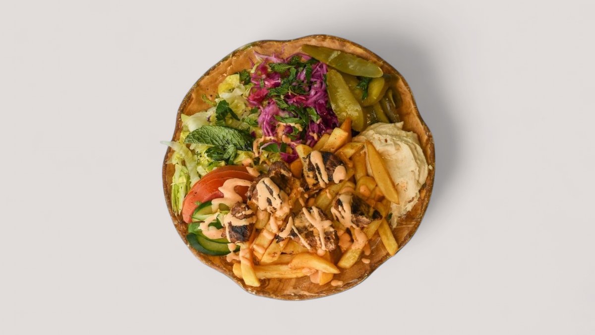 alle Gerichte werden mit Teigfladen, Salat, Rotkraut, Petersilie, Zwiebeln, Tomaten, Gurken, Sauergurken und einer Beilage deiner Wahl serviert
