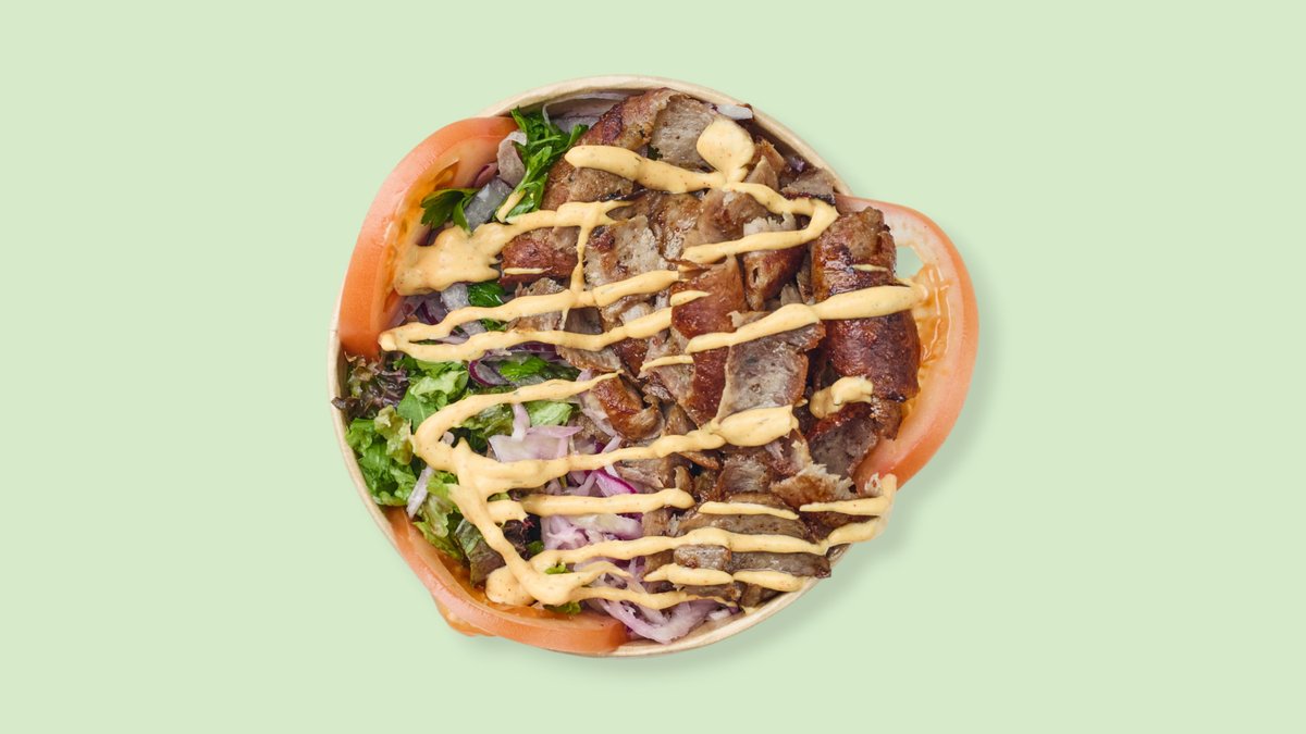 Dönerfleisch auf Reis mit frischem Salat , Sauce und drei Toppings deiner Wahl