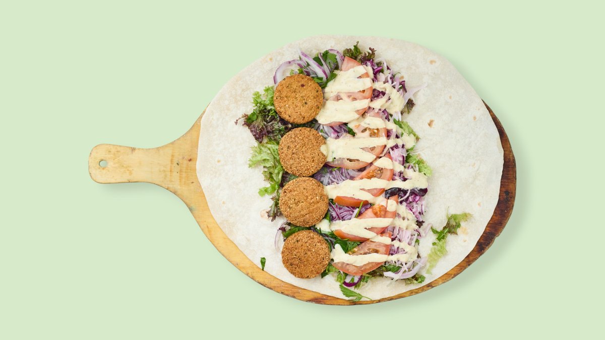hausgemachter Wrap mit knusprigen Falafelbällchen und frischem Gemüse