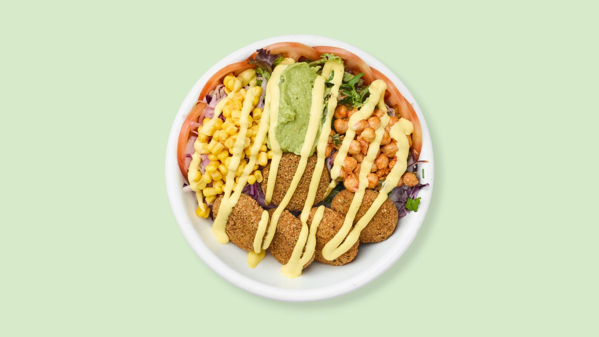 Falafelbällchen auf Reis mit frischem Salat , Sauce und drei Toppings deiner Wahl