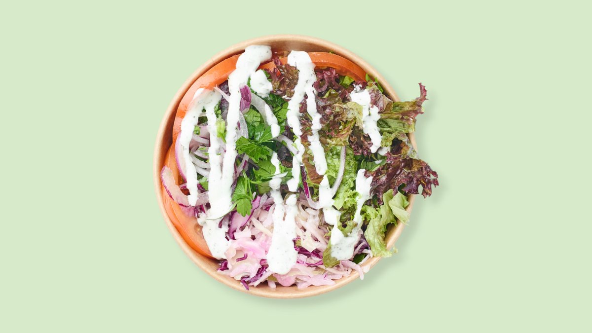 frischer gemischter grüner Salat mit Tomaten, Krautsalat, roten Zwiebeln und hausgemachtem Dressing