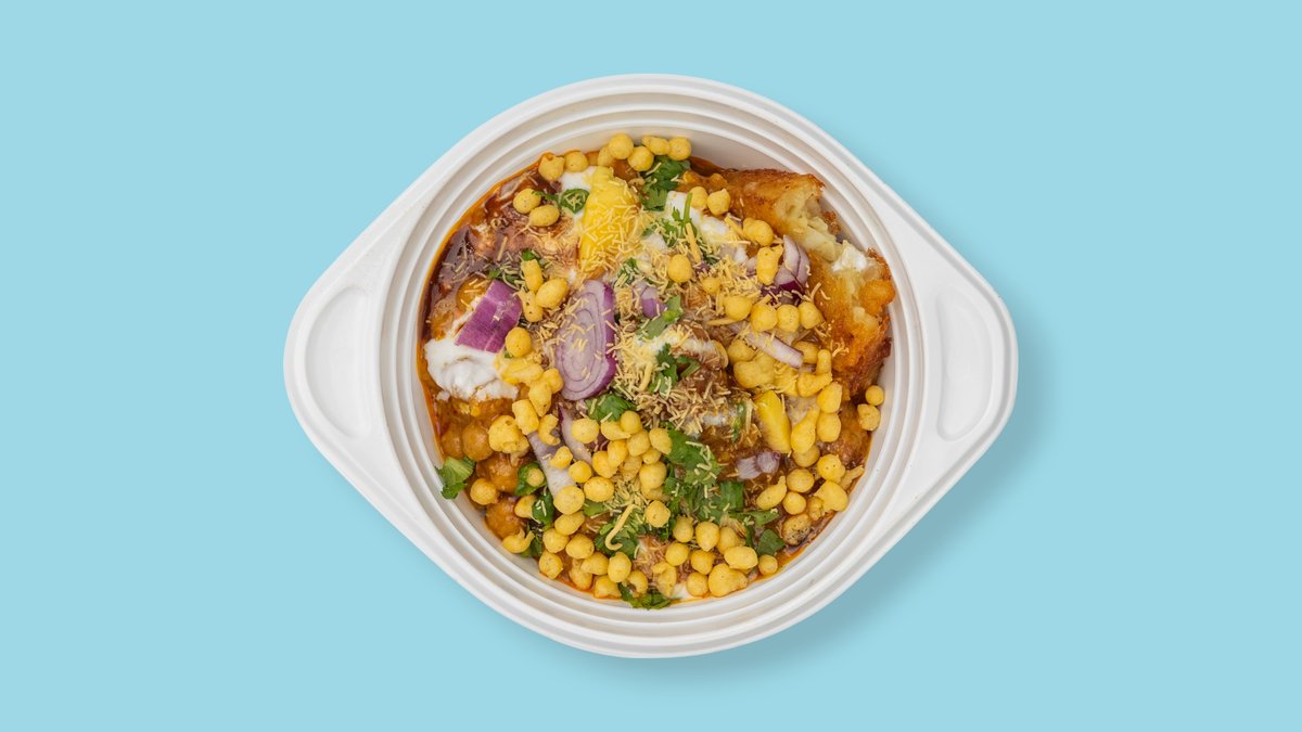 kleine Hohlkugeln gefĂĽllt mit speziellen FĂĽllungen (Kartoffeln, indischen GewĂĽrzen und knusprigen Snacks), sĂĽĂźer TamarindsoĂźe und saurer MinzsoĂźe