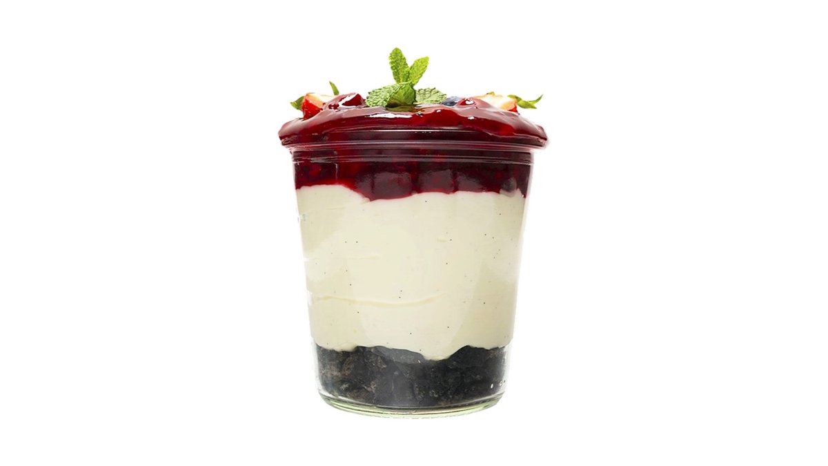 Fluffige Cheesecakecreme trifft auf Keks-Crunch und fruchtiges Beerenragout mit Vanillenote.