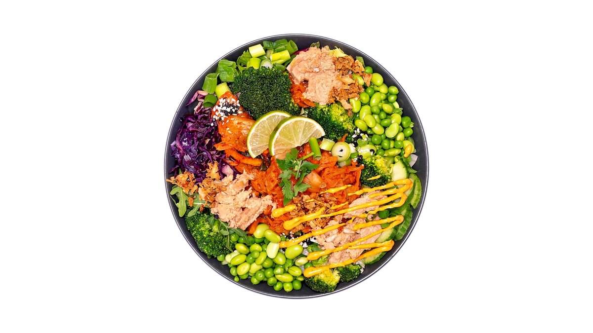 Pflanzlicher Tuna, feinster Kimchi von THATs KiMCHi, gedämpfter Brokkoli, zarte Edamame-Erbsen und vieles mehr. Getoppt mit crunchy Onions, Frühlingszwiebel, Koriander und unserer spicy Cream.