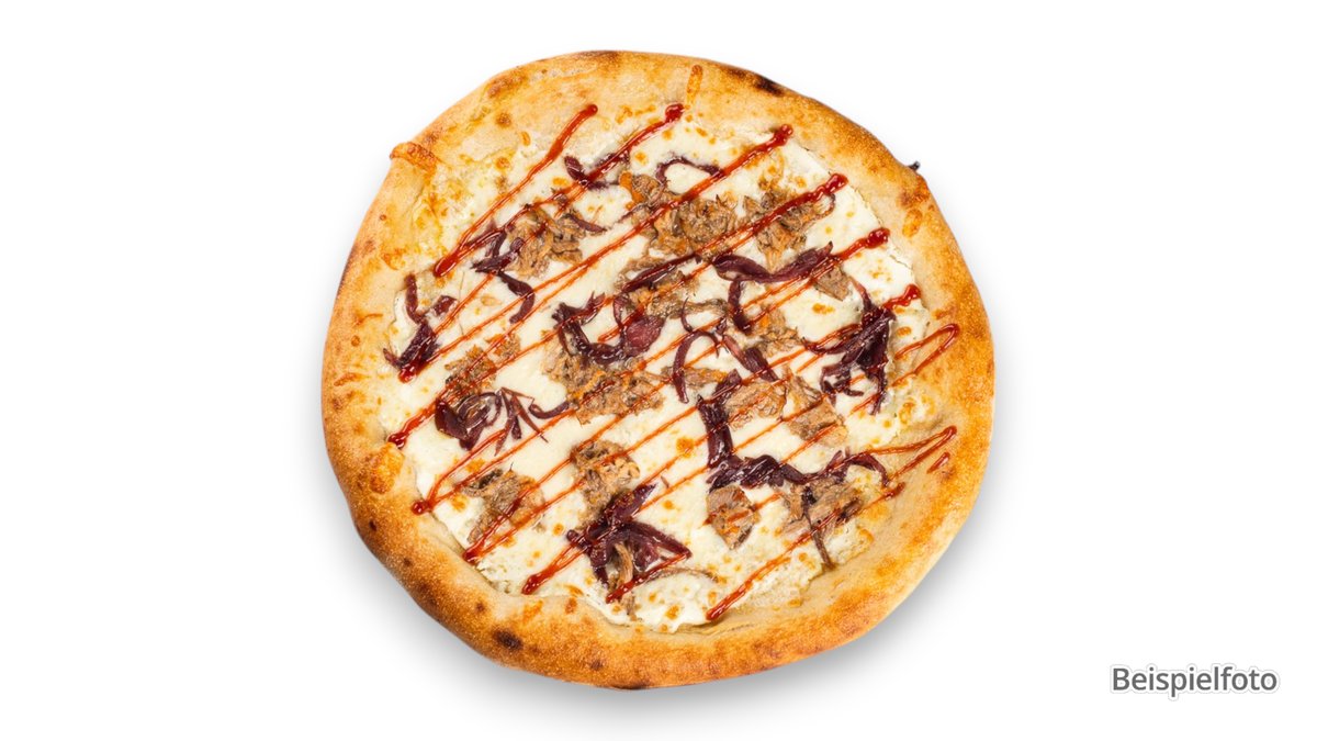 mit Barbecuesoße, Speck vom Rind, Rinderhackfleisch, roten Zwiebeln, Paprika und Mais