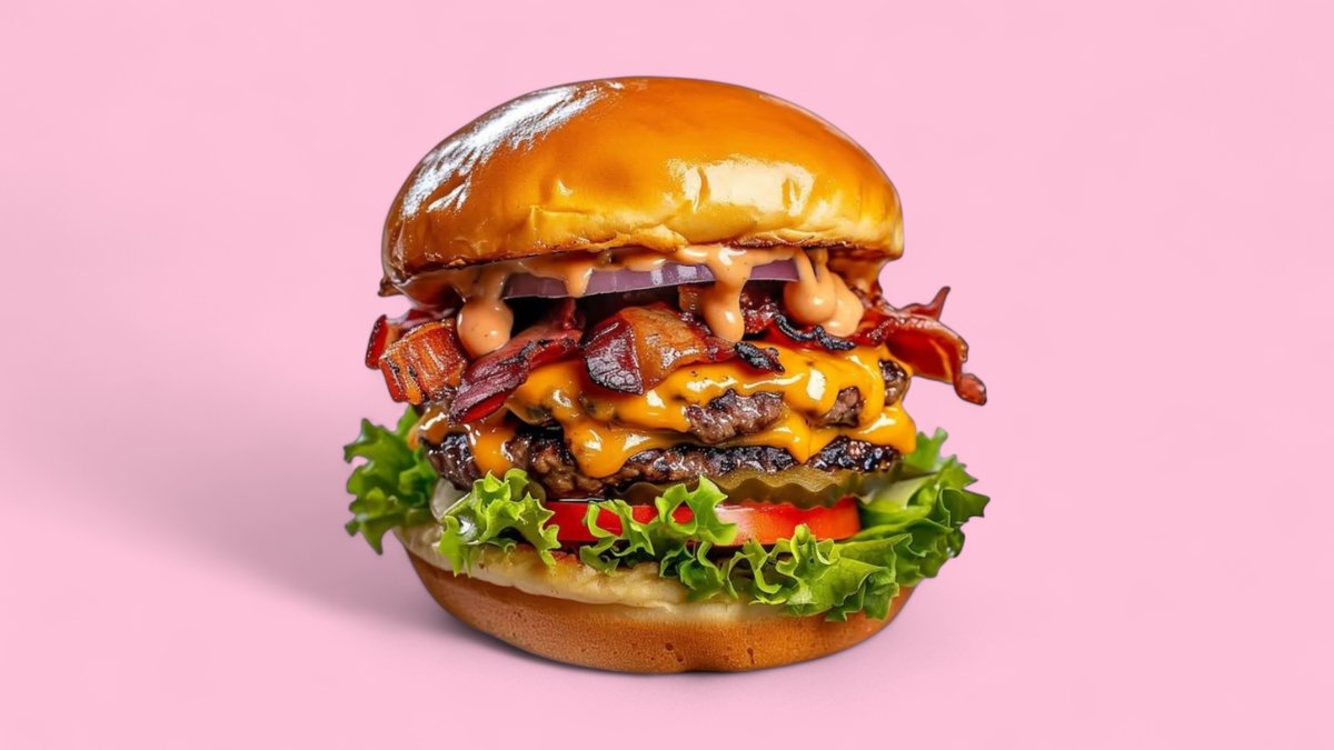 2x Rindfleisch-Patty, doppelt Cheddar, Salat, Tomaten, Gewürzgurken, Zwiebeln und einer Soße deiner Wahl