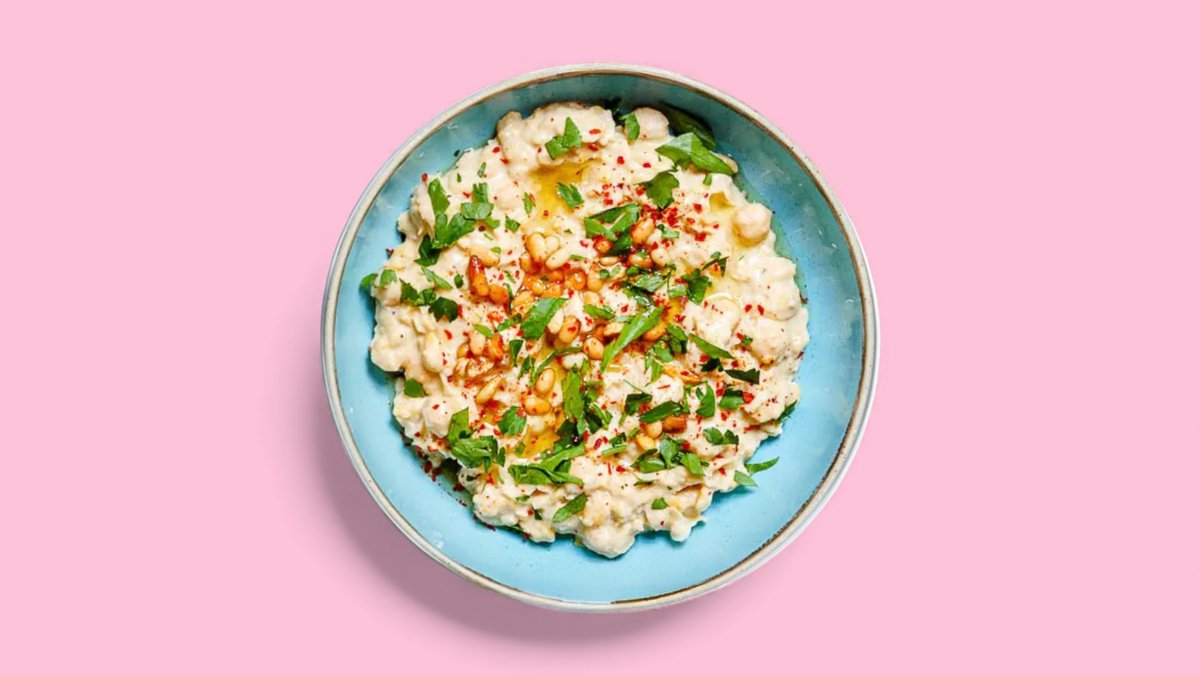 Auberginen, Tahini, Knoblauch, Zitronensaft, Olivenöl, Salz, Joghurt und Granatapfelkerne